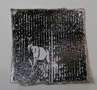 I stamped the wonderful Stag Night and covered him in gilding flakes, but he didn't show up too well so he's been used in the background. I've used bits of the waste to make domed stickers.